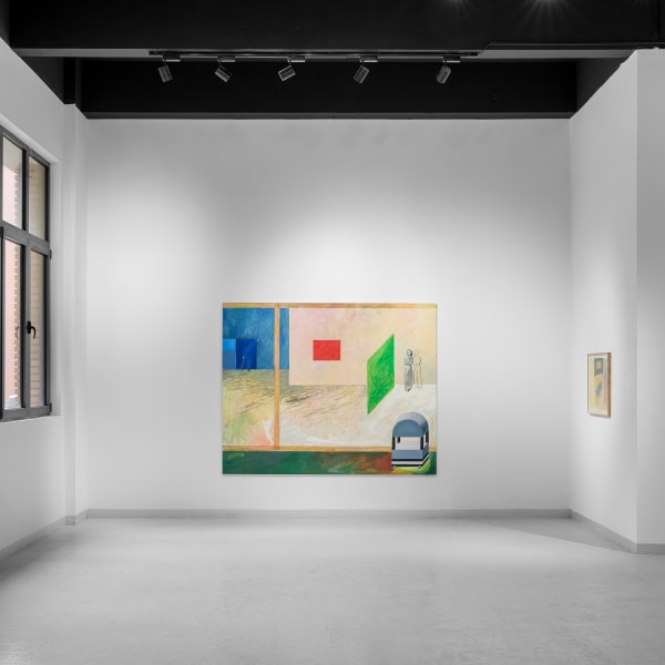 Dans Being installed, l’agentivité spectrale si caractéristique des figures de la peintre prennent une forme subtilement différente. Ici, le personnage ne se dissout pas dans l’espace : il en semble à l’origine. On l’aperçoit furtivement, en train de grimper, presque absorbé dans un carré de couleur qui évoque une œuvre murale — comme si, par sa simple présence, il activait la mise en espace elle-même. L’espace d’exposition, encore en cours de montage, se matérialise autour : aplats monochromes, structures murales, compositions inachevées. Ce tableau rend hommage aux gestes discrets, aux corps souvent invisibles qui installent, déplacent, construisent les conditions de visibilité de l’art. Ici, c’est le personnage qui engendre l’architecture. Being installed capte un moment transitoire : entre le geste à peine amorcé et l’espace à venir, entre apparition et organisation du visible.